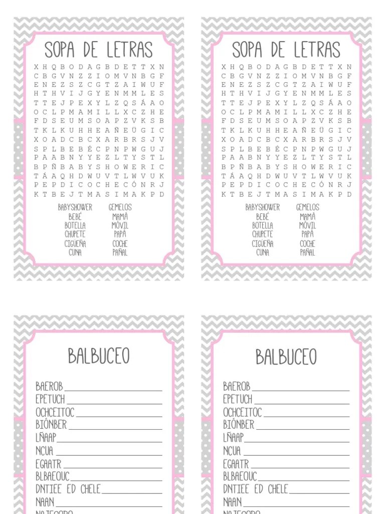 Lista de juegos de baby shower imprimibles. Se puede solicitar en cualquier color y se le agrega el nombre del bebé sin cargo. Baby shower games in spanish. Juegos de baby shower para imprimir. ¡10 juegos para imprimir para el baby shower! Descarga 7 juegos, sopa de letras, laberinto, crucigrama, bebé en idiomas, palabras revueltas listos para imprimir en formato pdf.